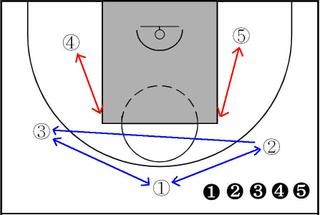 - 양쪽 윙에 위치한 2,3번 공격수는 윙이나 코너에서 3점슛을 시도하거나,