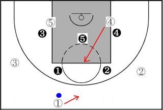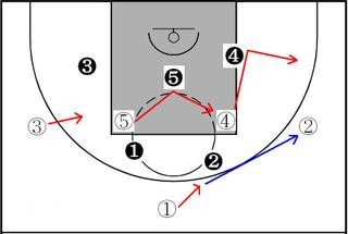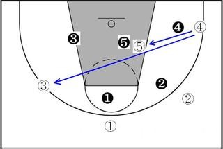 - 볼을 하이포스트의 공격수 5번에게 투입하고 4번이 베이스라인을 따라 빠르게 움직인다.