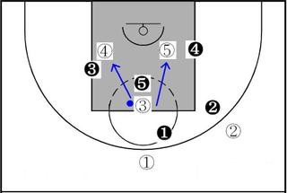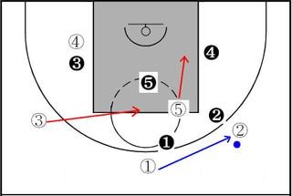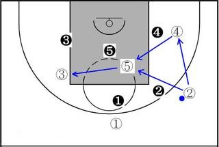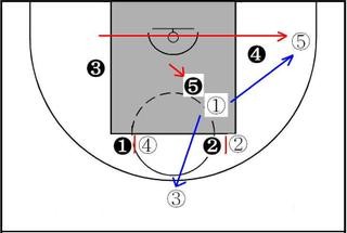 - 볼이 윙(2번)으로 패스가 되면 5번이 볼사이드의 로우포스트로 이동한다.