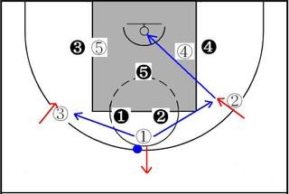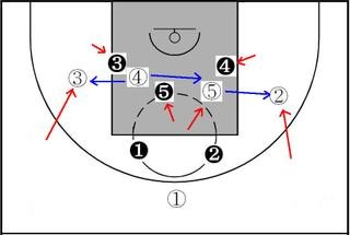 - 포인트가드가 신호를 주면 공격수 4번은 로우 포스트로 이동하여, 양쪽 로우 포스트에 2명의 공격수가 위치하도록 한다.