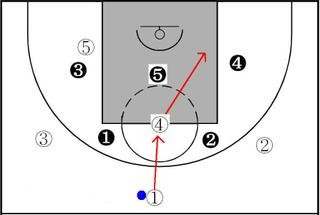 - 윙에서 하이 포스트로 이동한 공격수 5번은 패스를 받아 슛을 시도하거나, 바스켓을 향해 돌파를 시도한다.
